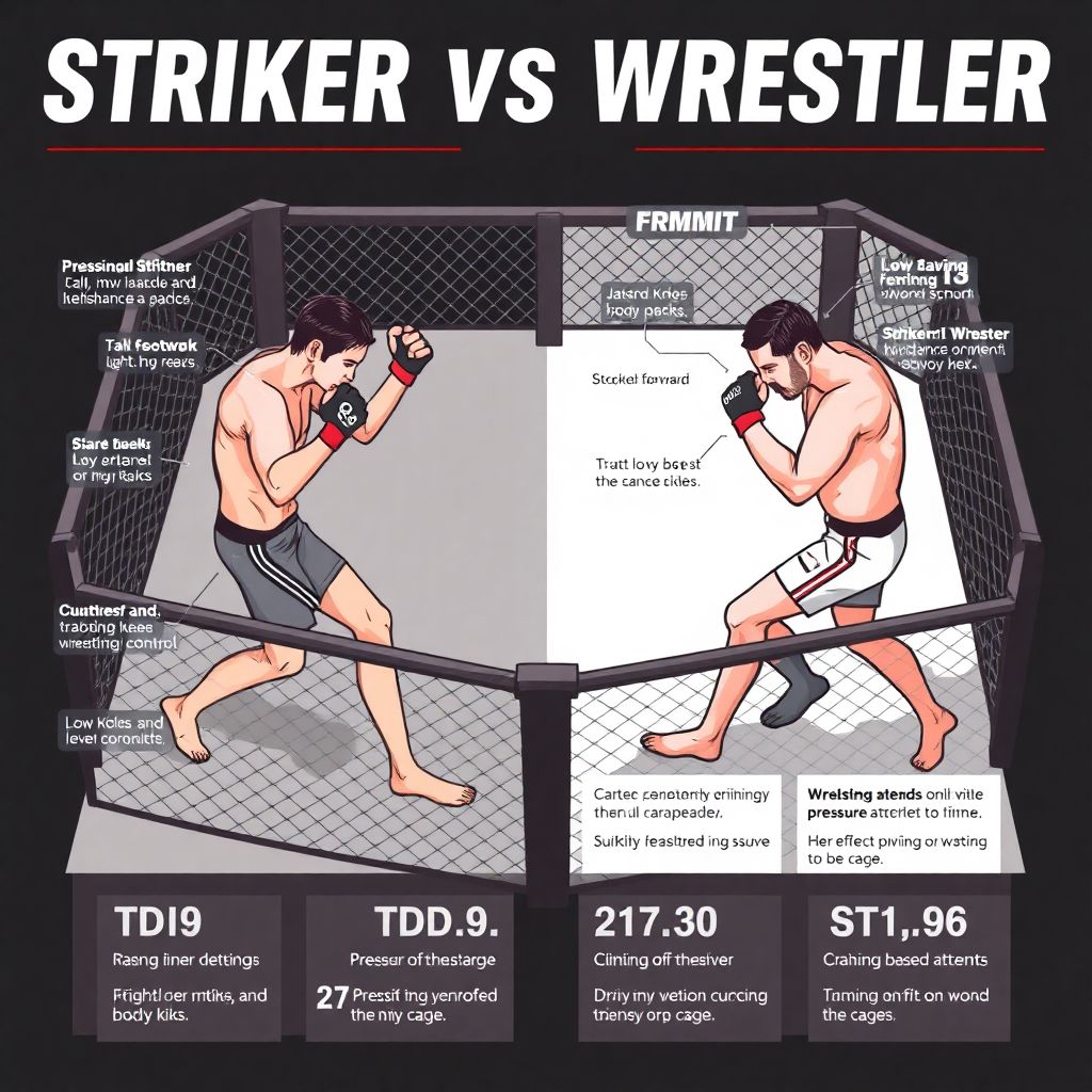 Страйкер становится фаворитом, когда у него есть пространство и время. Если боец с хорошим футворком не даёт себя запереть у клетки, встречает входы борца по корпусу коленями, апперкотами или джебом навстречу и правильно двигается по диагонали, борьба начинает «ломаться». Хрестоматийный пример — Израэль Адесанья против многих борцовских оппонентов: там, где его не могли зафиксировать у сетки, он буквально расстреливал соперников с дистанции, вынуждая их всё реже и реже идти в проходы. В таких боях страйкер наращивает преимущество с каждой минутой: борец тратит взрывную энергию на неудачные попытки перевода, а после 1–2 раундов его входы уже читаются и наказываются жёсткими контратаками.